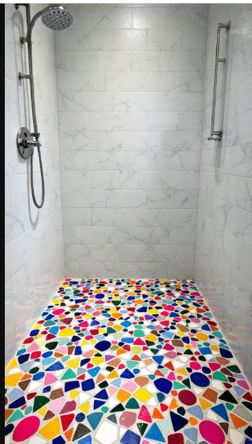 Mosaic tiles can instantly turn a simple shower floor into a striking centerpiece. In this example, a mix of colors and shapes creates a dynamic, eye-catching design where every tile contributes its own character.