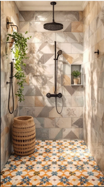 Patterned cement tiles are a stylish way to infuse personality into your shower design. In this example, a vibrant mix of colors and shapes instantly adds character, turning the floor into a focal point. The intricate patterns aren’t just beautiful—they also do a great job of camouflaging water spots and everyday wear better than plain tiles.