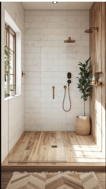 Adding greenery, as shown here, enhances the natural look and brings a refreshing touch to the space. A few carefully chosen decorative accents can further personalize the design, making your shower feel like a stylish retreat.