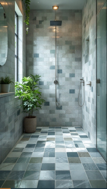 For an eco-friendly bathroom upgrade, recycled tiles are a stylish and sustainable option. In this example, shades of green and gray come together to create a soothing, spa-like shower atmosphere that feels both calming and refreshing.