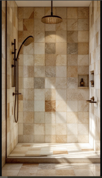 Natural stone tiles bring a timeless elegance to bathroom design, and the shower shown here is a perfect example. Clad in soft beige and earthy tones, the tiles create a warm, welcoming atmosphere that pairs effortlessly with a wide range of décor styles.