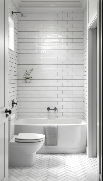 In this design, glossy white subway tiles reflect light beautifully, opening up the space and giving it a fresh, airy feel. Subtle black grout lines add just the right amount of contrast, accentuating the crisp geometry of the tiles.
