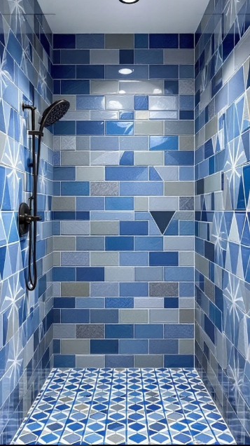 Bold geometric patterns can transform a bathroom shower into a true statement feature. In this design, a mix of blue tiles in varying shapes—rectangles, triangles, and diamonds—creates a dynamic visual rhythm that instantly draws the eye and adds depth to the space.