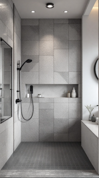 Textured wall panels can bring a distinctive edge to shower design, instantly elevating the space. In this example, sleek gray tiles with subtle variations in tone create a modern, inviting atmosphere while adding visual depth.