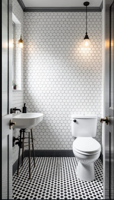 Hexagon tiles carry a timeless charm that instantly adds a vintage touch to any bathroom. In this design, crisp white hexagon tiles cover the walls, while the floor features a bold black-and-white pattern. The combination strikes a perfect balance—bright and airy above, grounded and sophisticated below.