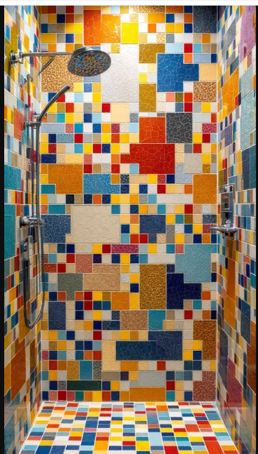 Mosaic tile accents can turn a bathroom shower into a vibrant, artful retreat. In this design, a playful mix of colors and patterns creates an atmosphere full of energy and charm, with each tile adding to a one-of-a-kind composition.