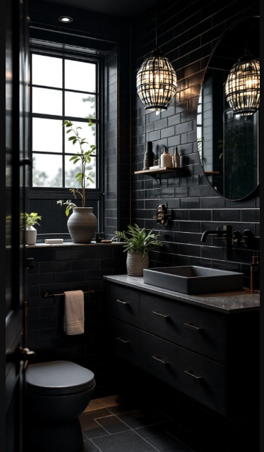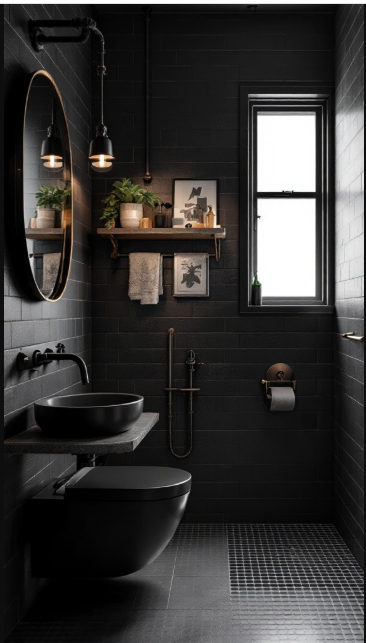 This sleek black bathroom beautifully embodies industrial style with its bold, cohesive design. Dark tiles cover the walls, setting a strong backdrop, while black fixtures like the sink and toilet create a streamlined, modern edge.