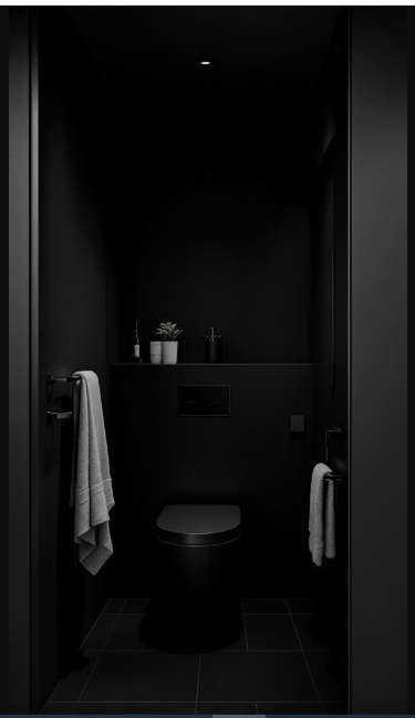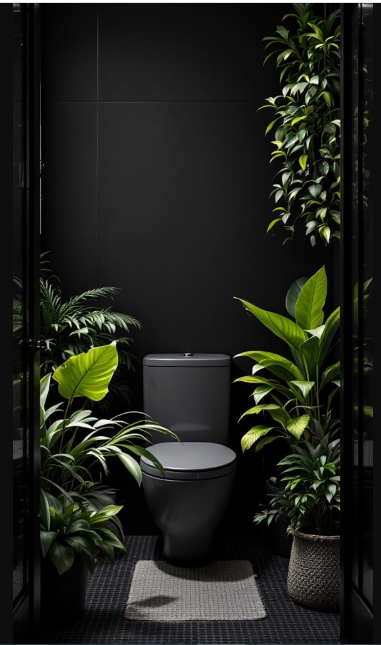 Designing a small black bathroom is a bold move, and introducing greenery is the perfect way to balance the look. In this example, vibrant plants frame a sleek black toilet, blending modern elegance with a refreshing natural touch. The dark walls serve as a dramatic backdrop, allowing the rich greens to truly stand out.