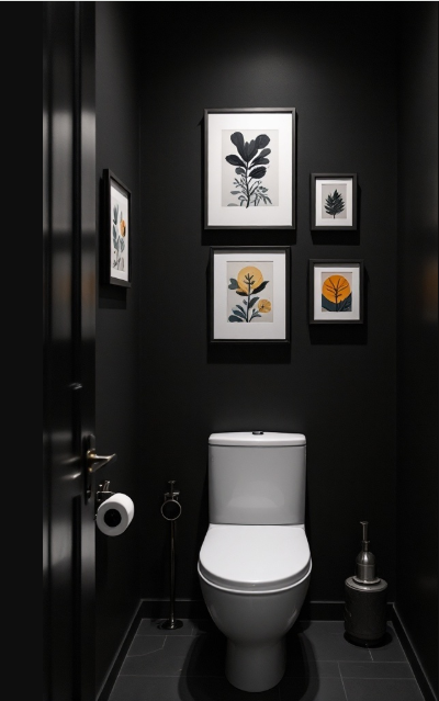Artistic wall décor can completely elevate the look of a small black bathroom. Picture stepping into a sleek, dark space where carefully chosen artwork stands out against the deep black walls, instantly adding character and charm.