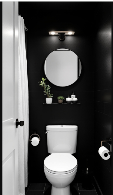 Bold contrasts can completely transform the look of a small black bathroom, making it both stylish and visually dynamic. In this design, sleek black walls and fixtures set the stage, while crisp white accents provide a striking balance. The interplay between dark and light instantly elevates the space, giving it depth and character.