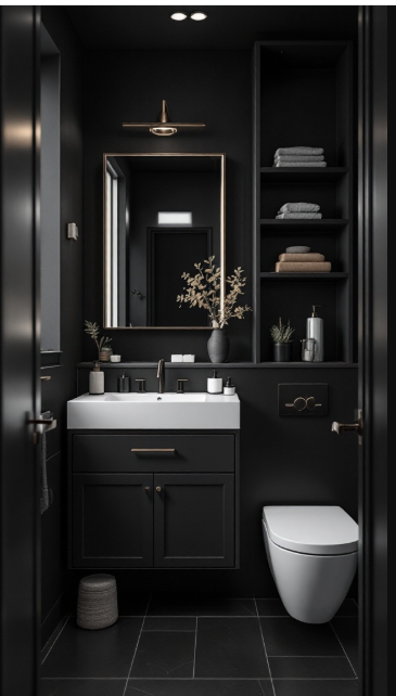 Altogether, this design proves that dark tones can work beautifully in small bathrooms when paired with contrast, clever lighting, and thoughtful accents—resulting in a space that feels both bold and inviting.