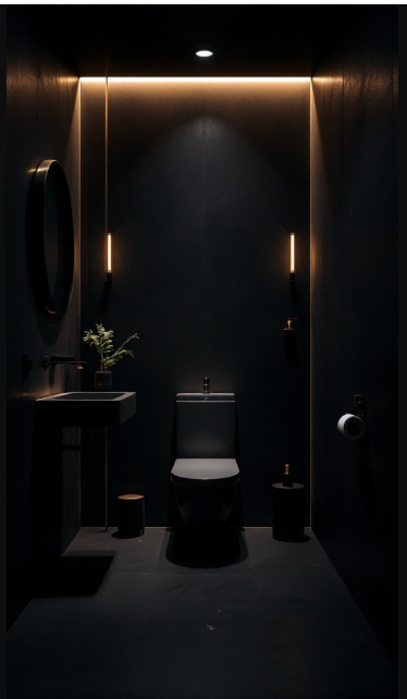 When designing a small black bathroom, lighting is one of the most important elements to consider. In this example, the lighting creates a cozy, welcoming atmosphere despite the compact size. Rather than relying on harsh overhead fixtures, the use of softer, indirect lighting enhances the mood and elevates the overall design.