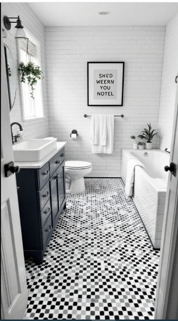 Hexagon tiles are a timeless choice for bathrooms, bringing both charm and character to the space. In this design, the floor tiles create depth and visual interest with a mix of black, white, and gray tones.