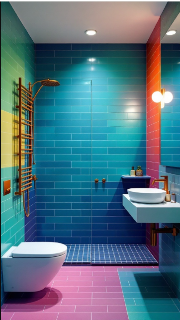 Beyond aesthetics, colorful tiles can also define different zones within the bathroom. A gradient effect—from green to blue to pink—creates a natural flow that guides the eye around the space while adding a sense of movement.