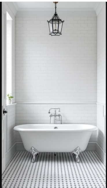 In this example, the subway tiles form a seamless backdrop for a freestanding clawfoot tub. The understated tiles highlight the tub’s ornate details, striking a perfect balance between vintage character and modern refinement. Meanwhile, the black-and-white floor tiles add contrast, giving the space depth and visual interest.