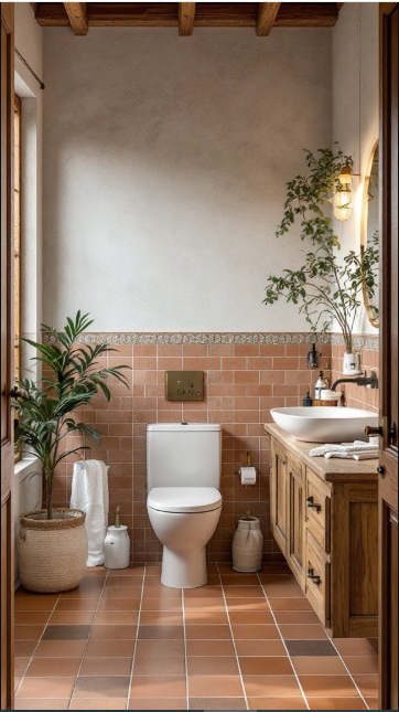 Rustic terracotta tiles infuse warmth and charm into any bathroom, creating an inviting and cozy atmosphere. Their rich, earthy tones pair beautifully with natural wood accents and greenery, as seen here where the tiles flow seamlessly from floor to wall, enhancing the rustic character of the space.