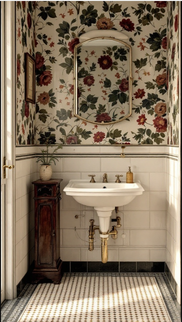 Paired with simple fixtures, the vintage tiles achieve a timeless balance of coziness and elegance. The clean white sink contrasts beautifully with the detailed prints, highlighting the grace and sophistication of traditional design while keeping the bathroom functional and stylish.