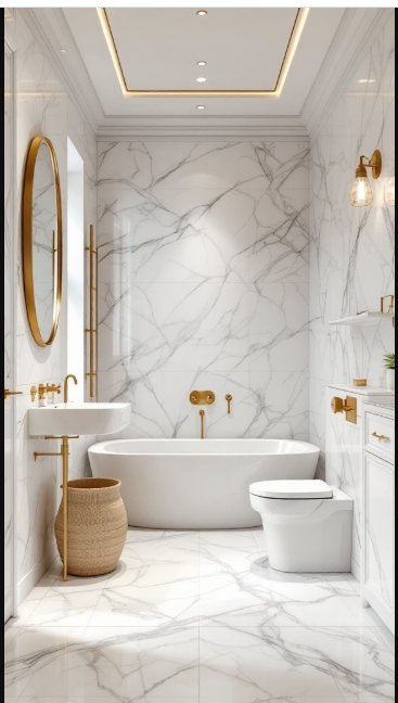 Paired with warm gold accents—such as faucets and lighting—the marble takes on a luxurious yet welcoming feel. This balance of refinement and warmth transforms the bathroom into a sophisticated retreat.