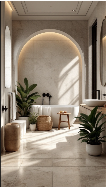 Using large stone tiles across the floors and walls creates a seamless flow, making the bathroom feel more open and spacious. Rounded arches and gentle lighting add interest and depth while maintaining a calming, uncluttered look.
