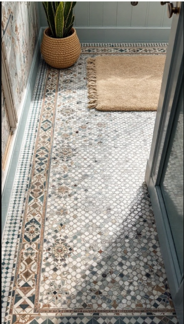 Mosaic tiles are a timeless way to bring artistry and character into a bathroom. In this design, the floor features intricate patterns that immediately draw the eye, with each tile combining colors and shapes to create a one-of-a-kind look.
