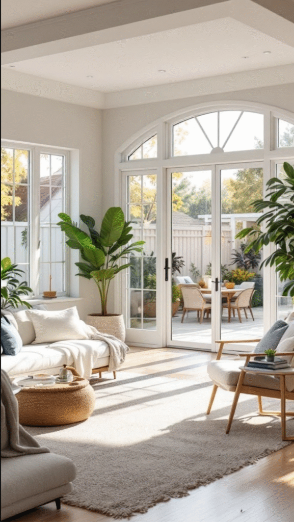 The sunlight beautifully accentuates the soft, neutral tones of the furniture and walls, highlighting the textures of the cozy rug and plush sofa. This blend of light and texture makes the space feel both elegant and inviting. Adding plants enhances the fresh, natural vibe, strengthening the connection to the outdoors.