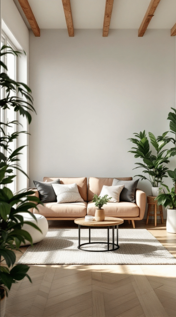 The natural wood beams paired with light-colored walls contribute to a bright, airy feel, while the greenery beautifully complements the muted tones of the sofa and pillows, adding texture and a touch of nature. Mixing different plant sizes and shapes adds depth and keeps the look visually engaging.