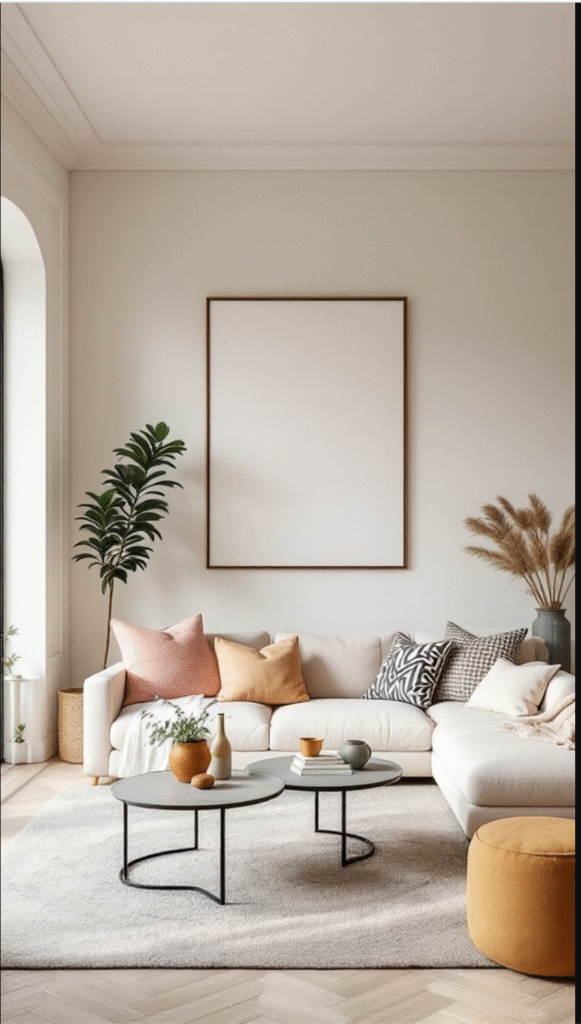 The room’s light, neutral palette enhances its airy feel. Soft beige and cream tones on the couch and cushions blend effortlessly, while subtle earthy accents provide just the right amount of contrast. This thoughtful mix fosters a calm and serene environment—ideal for unwinding after a busy day.