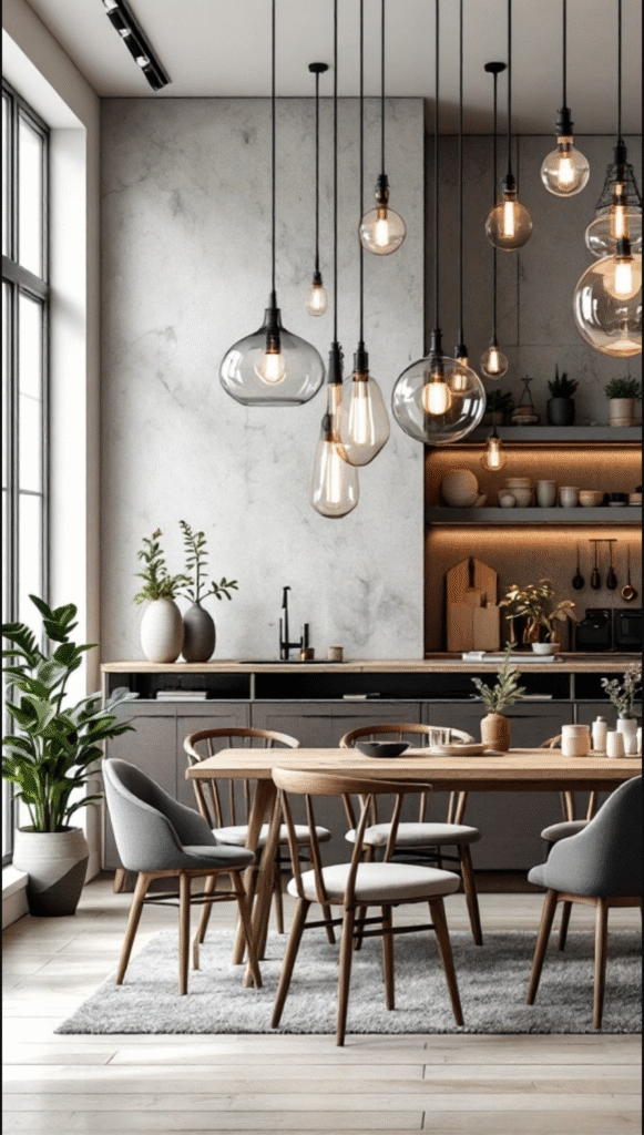 In modern interiors, statement lighting fixtures play a crucial role in setting the mood and elevating living and dining spaces. This image features a welcoming room where a collection of pendant lights hang elegantly, creating a captivating focal point that draws the eye upward. Their distinctive shapes and warm glow turn the area into a cozy, inviting gathering spot.