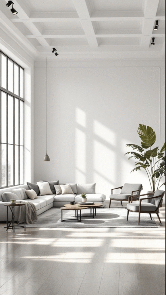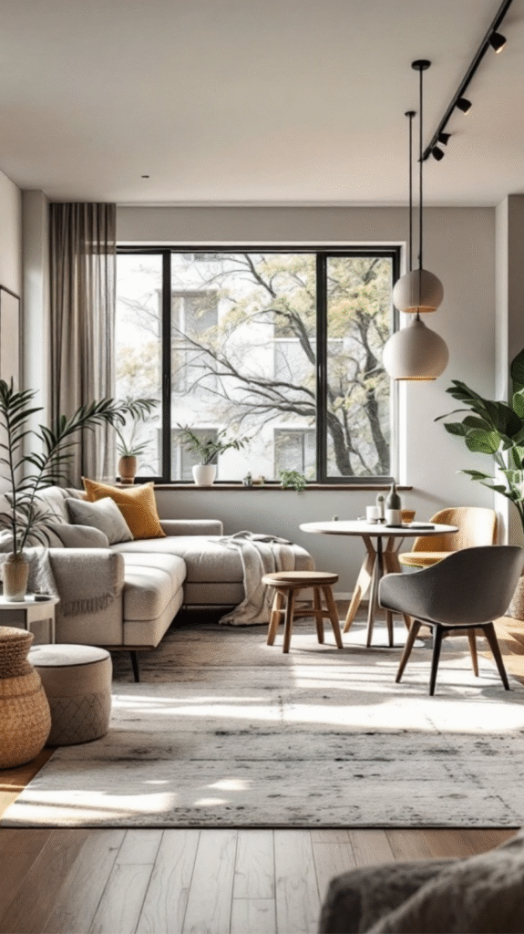 The furniture arrangement encourages conversation, with a sectional sofa and sleek chairs forming a comfortable gathering spot. A small coffee table adds functionality without crowding the room, while a subtle area rug brings everything together. Adding plants introduces warmth and vitality, making the space feel truly homey and inviting.