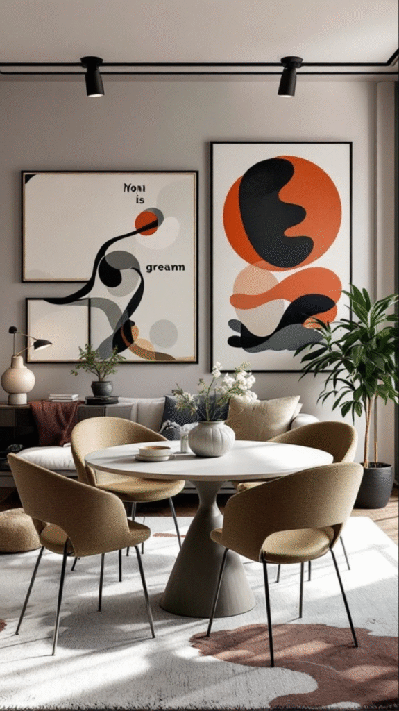The bold colors—orange, black, and soft earthy tones—create a cohesive palette that’s echoed in the furniture and accessories, making the whole space feel harmonious. The round dining table mirrors the soft curves and shapes in the artwork, enhancing the sense of flow between the zones.