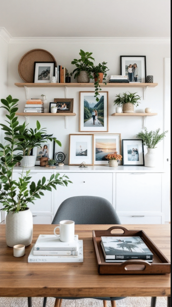 Framed photos add another layer of charm. Displaying meaningful moments sparks joy and can even inspire conversations. The casually curated arrangement above the shelf shows how you can creatively showcase your memories while keeping things stylish and fun.