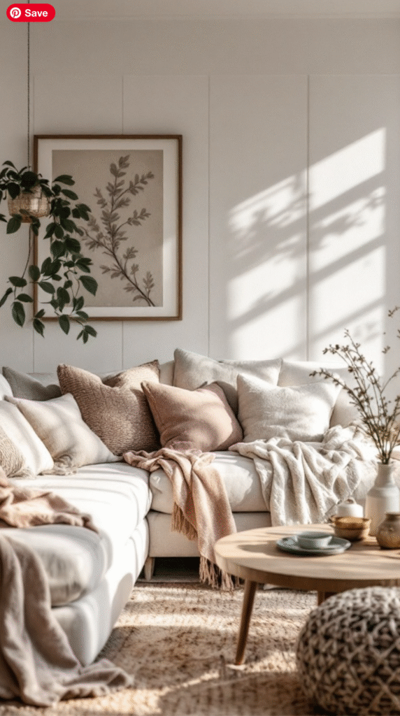Natural materials like the woven rug and wooden coffee table amplify the layered texture effect. These elements not only look beautiful but also feel comforting underfoot, making the room warm and welcoming for guests. The addition of greenery introduces a fresh, lively touch that complements the space’s earthy vibe.