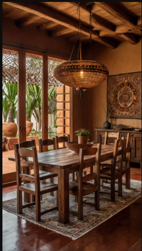 Turn your dining room into a warm and inviting rustic Mexican retreat by introducing a sturdy wooden dining table paired with woven or handcrafted chairs. Traditional Mexican tables often showcase rich, dark woods accented with hand-painted details or mosaic inlays, adding artistry and authenticity to the space. Complete the look with a colorful Mexican table runner and rustic pottery to capture that timeless charm.