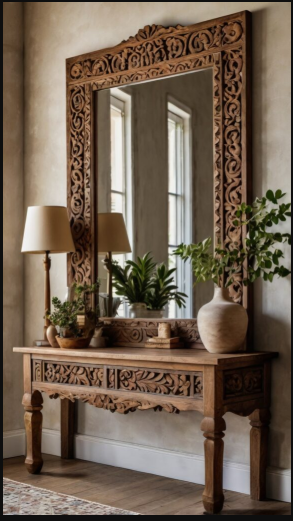 Mirrors are a staple in rustic Mexican décor, especially when framed with beautifully carved wood or ornate wrought iron. They make stunning focal points—whether placed above a mantel, in an entryway, or incorporated into a gallery wall. The detailed craftsmanship of these frames adds a sense of authenticity and old-world charm, perfectly embodying the rustic Mexican aesthetic.