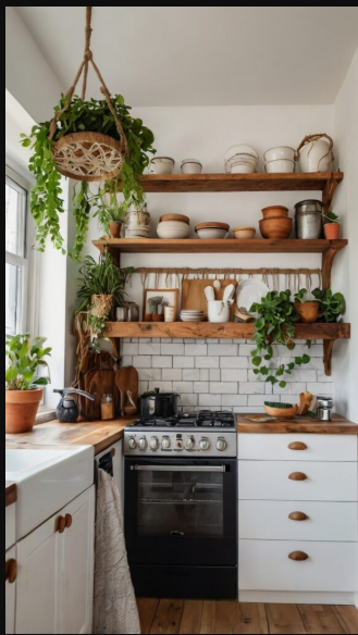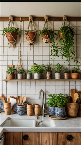 A hanging herb garden adds both beauty and function to your kitchen. Use wall-mounted planters, wooden racks, or macrame hangers to display fresh herbs like basil, mint, and thyme, which bring greenery and delightful aromas. This setup combines boho charm with everyday practicality.