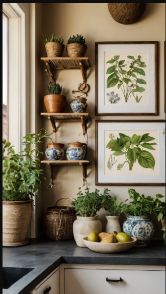 Framed botanical prints bring vintage charm and earthy elegance to any kitchen. Choose artwork featuring muted florals, soft greens, and natural subjects, and pair them with wood, brass, or rattan frames for a cohesive boho look. They’re perfect for creating small, gallery-style clusters on your walls.