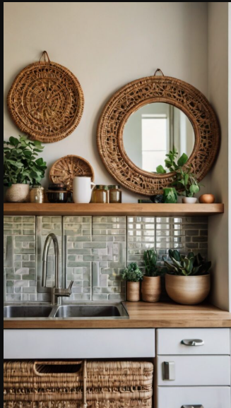 Mirrors with rattan, bamboo, or wicker frames brighten walls and make spaces feel larger. Their round, organic shapes soften the room while adding a vintage-boho flair. Position one above a sideboard or sink to create visual interest, and pair it with natural, neutral tones for a cohesive look.