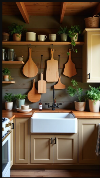 Showcase your wooden cutting boards by hanging them on wall hooks or rails. Opt for boards with rustic finishes or unique grain patterns. Beyond their functionality, they add natural, organic texture to your kitchen walls—ideal for a farmhouse-meets-boho style.