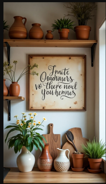 Add a personal touch to your kitchen walls with handwritten quote signs on wood or chalkboards. Select uplifting messages or food-themed sayings. The handwritten style brings a relaxed, cozy, and lived-in feel, infusing warmth and personality into the space.