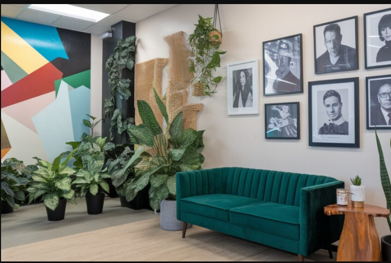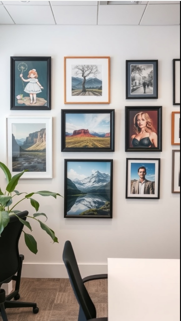 Displaying framed artwork from local artists is a wonderful way to add personality and showcase your community’s creativity in your office. The image features a variety of frames, each holding a unique piece—from serene landscapes to striking portraits—offering something to appeal to every taste.