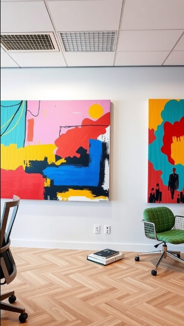 For example, the image features two striking abstract canvases: one blends reds, yellows, and blues, while the other bursts with vibrant greens and pinks. These artworks not only elevate the visual appeal of your office but also act as engaging conversation starters.