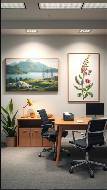 Nature-inspired prints can instantly bring life and tranquility to any office. In the image, two stunning prints are featured: one depicts a serene mountain landscape with a calm lake, while the other bursts with vibrant floral patterns. Together, they introduce a refreshing touch of the outdoors, creating a soothing and inviting atmosphere.