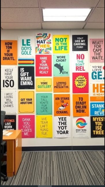 Motivational posters are an easy way to infuse color and positivity into any office. The image features a vibrant wall covered with an array of posters, each carrying a unique message that sparks creativity and productivity, making the space both visually engaging and inspiring for employees and visitors alike.