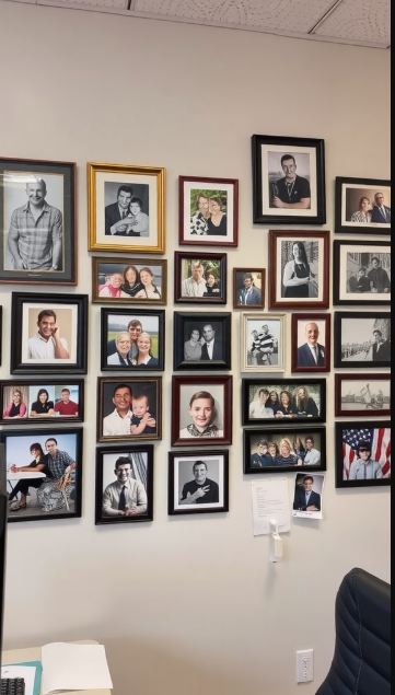 Creating a personalized photo gallery can turn a plain office wall into a warm, inviting space. The image features a curated collection of framed photos capturing moments with family, friends, and pets. This mix of memories adds personality to the workspace, making it feel uniquely yours.