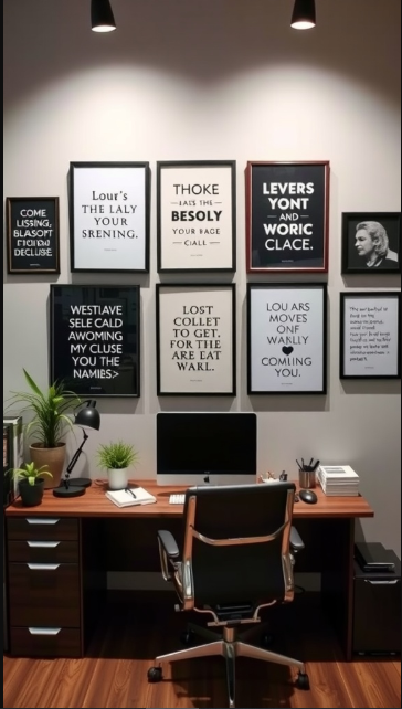 Transforming your office with inspiring quote wall art can have a powerful impact on your daily motivation. The image showcases a beautifully arranged wall of framed quotes, each carrying a unique message. These pieces not only add character to your space but also serve as constant reminders of positivity and determination.