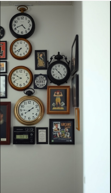 The clocks stand out for their variety—ranging in style and size, from ornate, detailed frames to simple, classic designs. This mix creates a playful, nostalgic rhythm that feels both inviting and visually engaging.