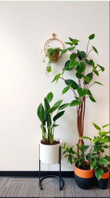 Indoor plant wall arrangements can instantly refresh your office space. The image highlights a thoughtfully curated setup, featuring a small hanging planter that adds vertical interest alongside larger potted plants that beautifully fill the floor area.