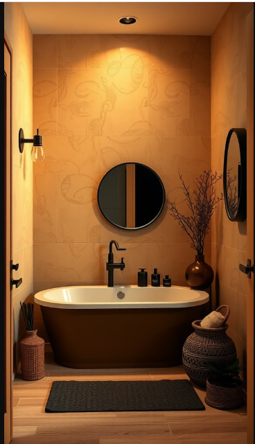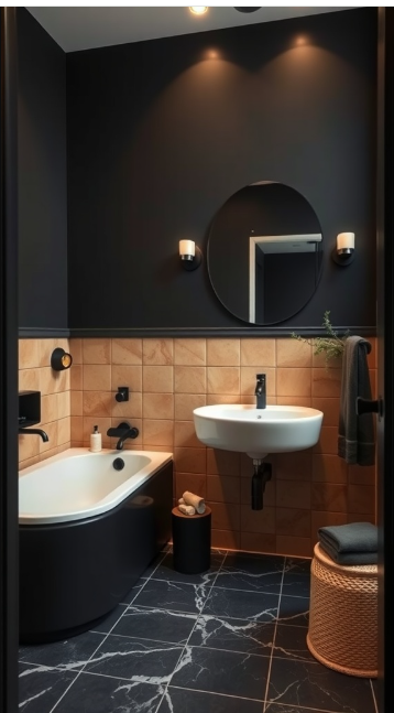 Tan elements, particularly in the tiles, introduce a natural warmth that balances the intensity of the black. This contrast gives the bathroom a modern yet cozy feel, while features like a circular mirror and sleek fixtures enhance the contemporary aesthetic without overpowering the room.