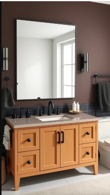 Natural light streams through the window, illuminating the space and highlighting the vanity’s details. Dark walls complement the tan finishes, lending the bathroom a cozy yet refined feel. This design strikes the perfect balance for anyone looking to create a chic and serene home retreat.