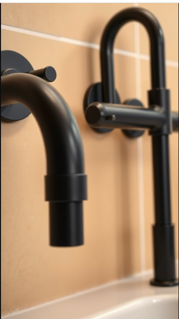The matte black taps and plumbing elements make a bold statement, their sleek lines adding a contemporary edge. More than just functional, each piece serves as a design feature, elevating the overall aesthetic of the space.